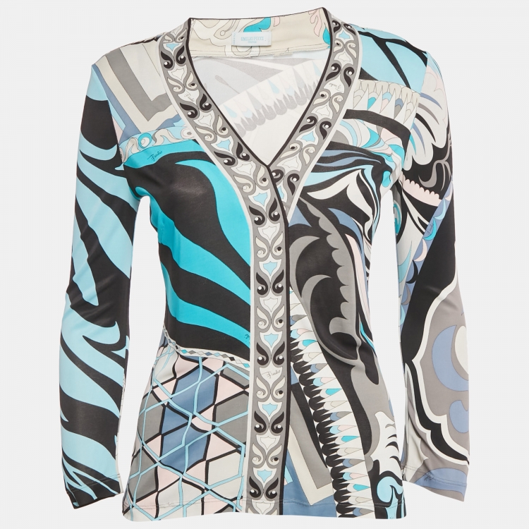 Pre Owned Emilio Pucci Multicolor Printed V Neck Jersey Blouse M