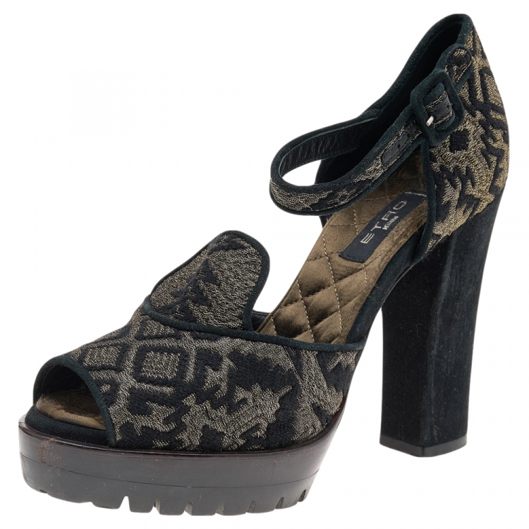 Etro Black Printed Brocade Fabric Ankle Strap Sandals Size 38