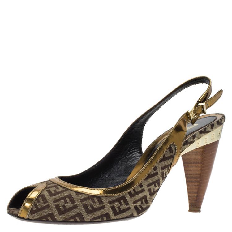 Fendi Gold Leather and Zucchino Canvas Peep Toe Slingback Sandals Size 40