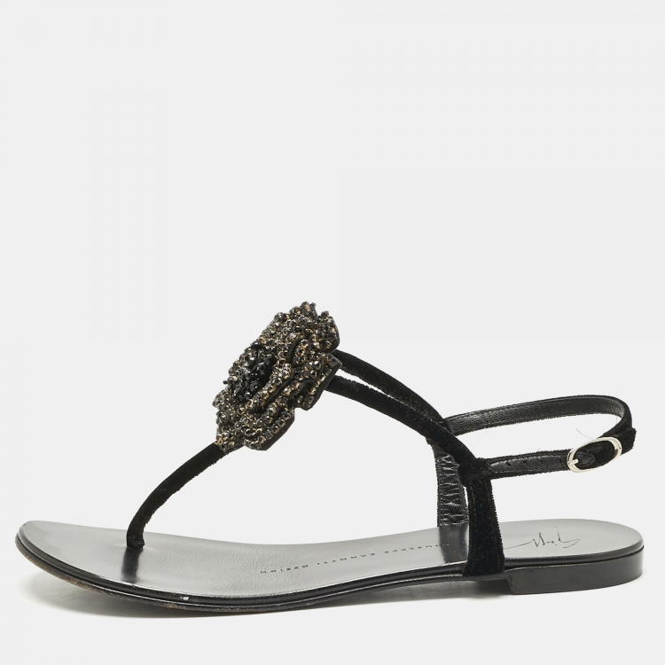 Giuseppe Zanotti Black Velvet Crystal Embellished Flower Flat Thong Sandals Size 36