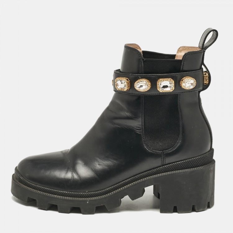 Gucci Black Leather GG Crystal Embellished Ankle Length Boots Size 38.5