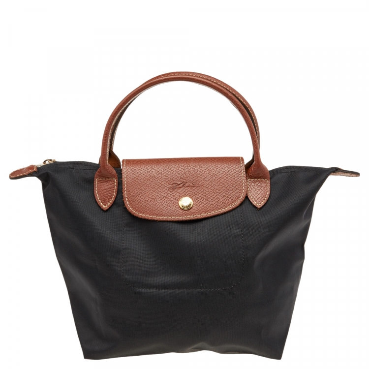Longchamp Black/Brown Nylon And Leather Small Short Le Pliage Tote