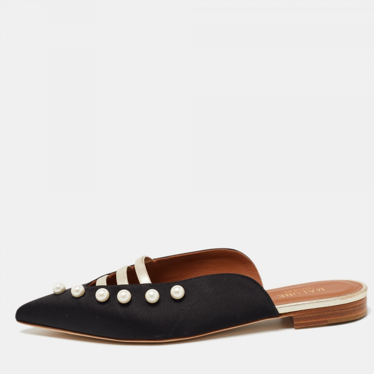 Malone Souliers Black/Gold Satin and Leather Zelda Flat Mules Size 38