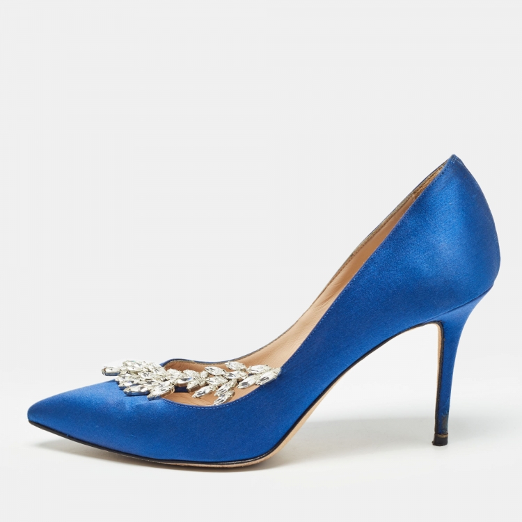Pre Owned Manolo Blahnik Satin Nadira Crystal Embellished Pointed Toe Pumps Size 37.5