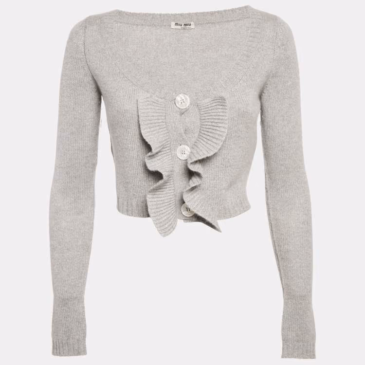 مملوكة مسبقًا Miu Miu Grey Rib Knit Ruffled Crop Cardigan S