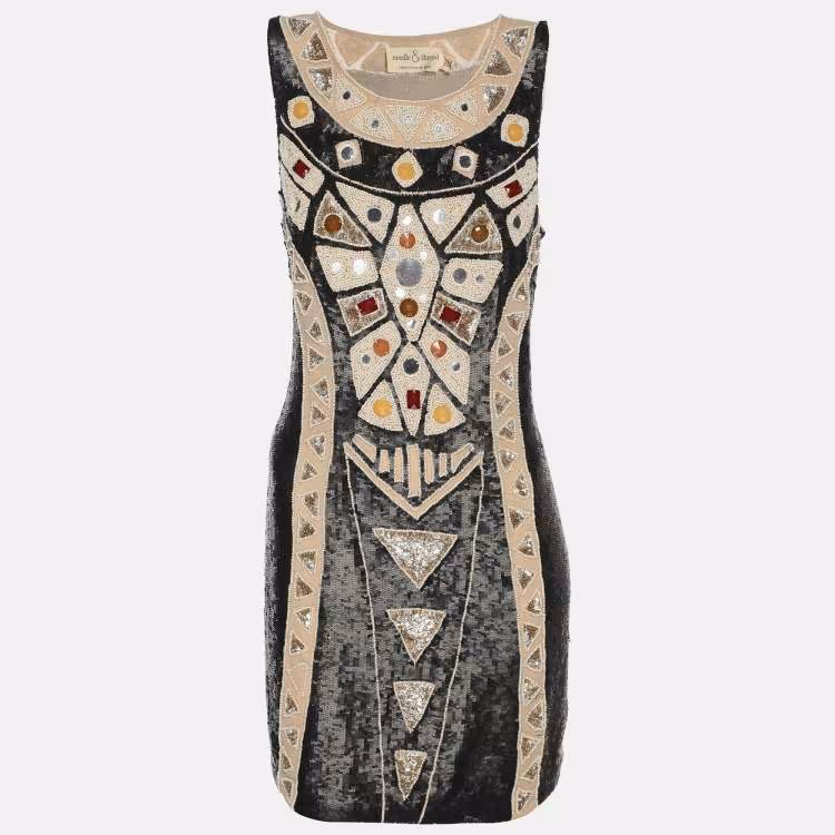 Pre Owned Needle & Thread Black Multicolor Sequin and Bead Embellished Sleeveless Top L