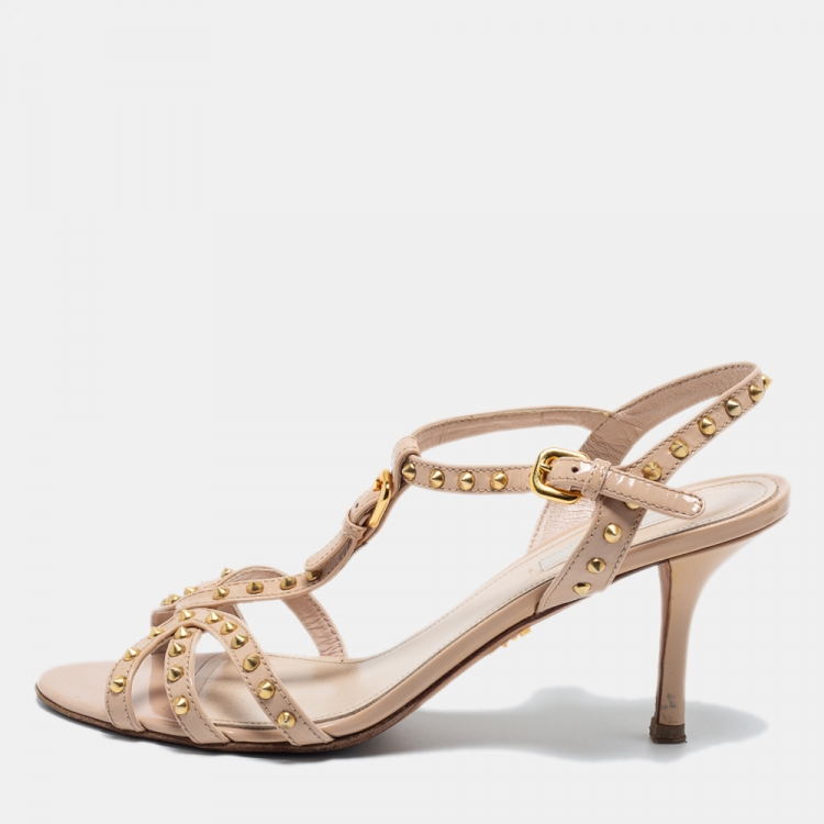 Prada Beige Patent Leather Studded T-Strap Sandals Size 37.5