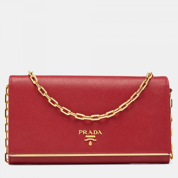 Prada Red Saffiano Metal Leather Flap Wallet on Chain