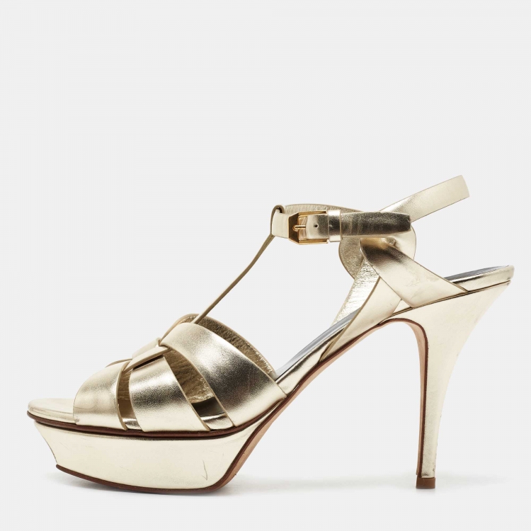 Saint Laurent Paris Gold Leather Tribute Platform Ankle Strap Sandals Size 40.5
