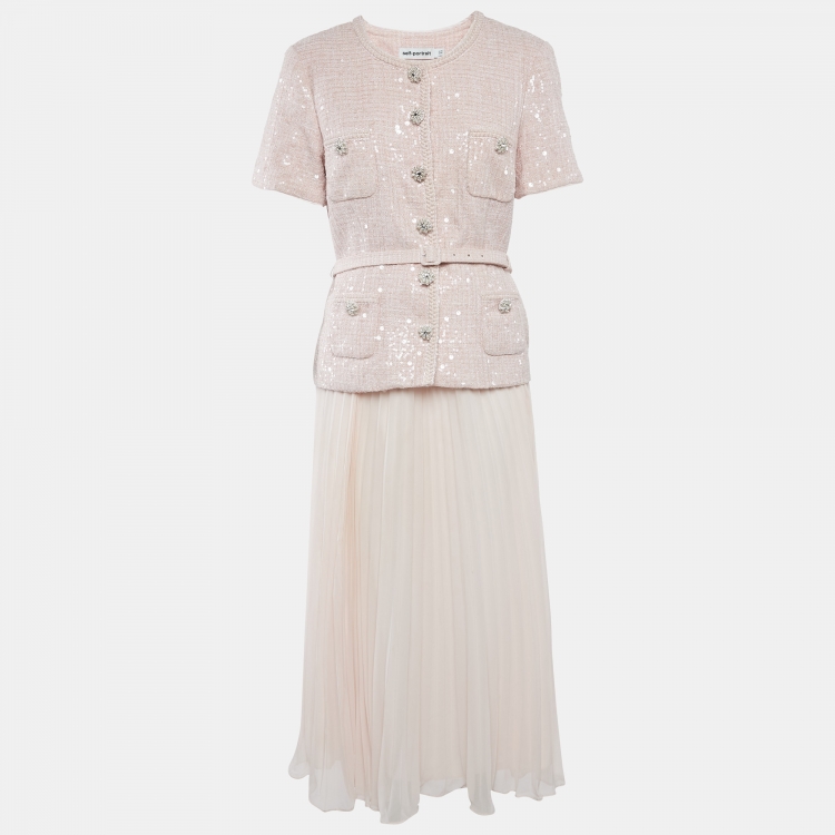 Pre Owned Self-Portrait Pink Boucle and Chiffon Plisse Midi Dress L