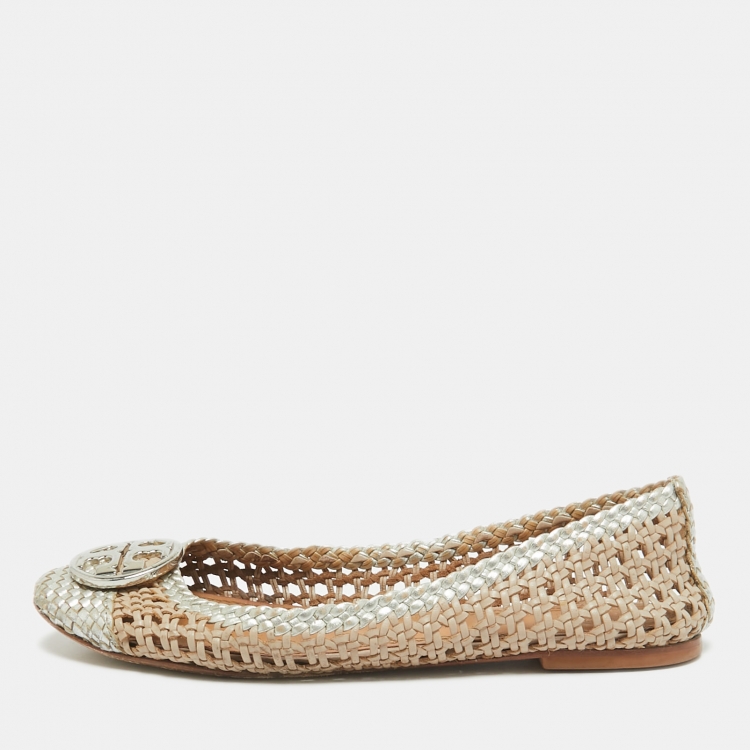 Tory Burch Gold/Silver Woven Leather Reva Scrunch Ballet Flats Size 37.5