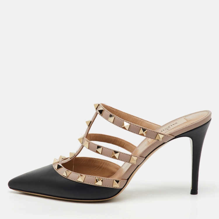 Pre Owned Valentino Black/Beige Leather Rockstud Pointed Toe Mules Size 38