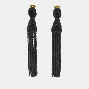 Oscar de la Renta Black Beaded Short Tassel Clip On Earrings