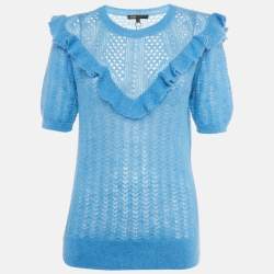 Maje Blue Mohair Wool Open Knit Ruffled Top L