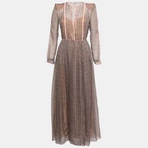 Fendi Brown/Pink Printed Silk Chiffon Long Sleeve Maxi Dress S