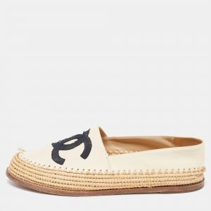 Pre Owned Chanel Cream/Beige Canvas And Leather CC Bow Peep Toe Platform Slingback Sandals Size 40.5