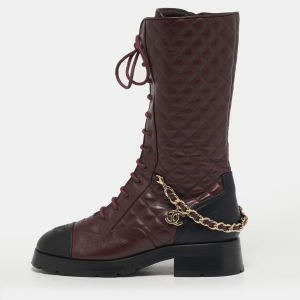 Chanel Size 40.5 Burgundy Cannage Chain Detail Leather Combat Boots