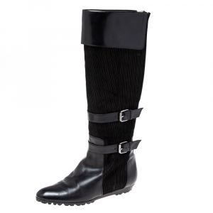 Oscar de la Renta Black Leather And Canvas Knee Length Boots Size 36.5