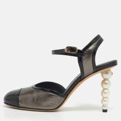 Chanel Black Leather and Fabric Cap Toe CC Faux Pearl Heel Pumps Size 41