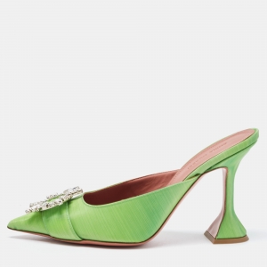Amina Muaddi Green Satin Crystal Embellished Begum Pointed Toe Mules Size 40.5
