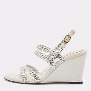 Chanel Grey Canvas Peep Toe Slingback Platform Sandals Size 37.5