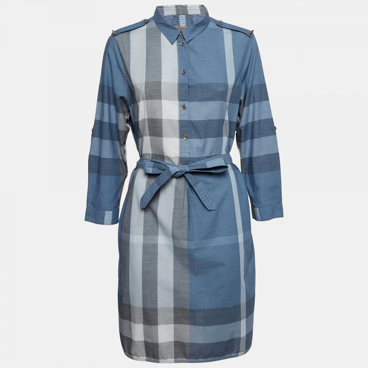 مملوكة مسبقًا Burberry Blue Novacheck Cotton Belted Short Dress L