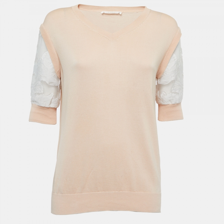 Pre Owned Chloe Beige Cotton Knit Floral Sleeve Detail Top XS