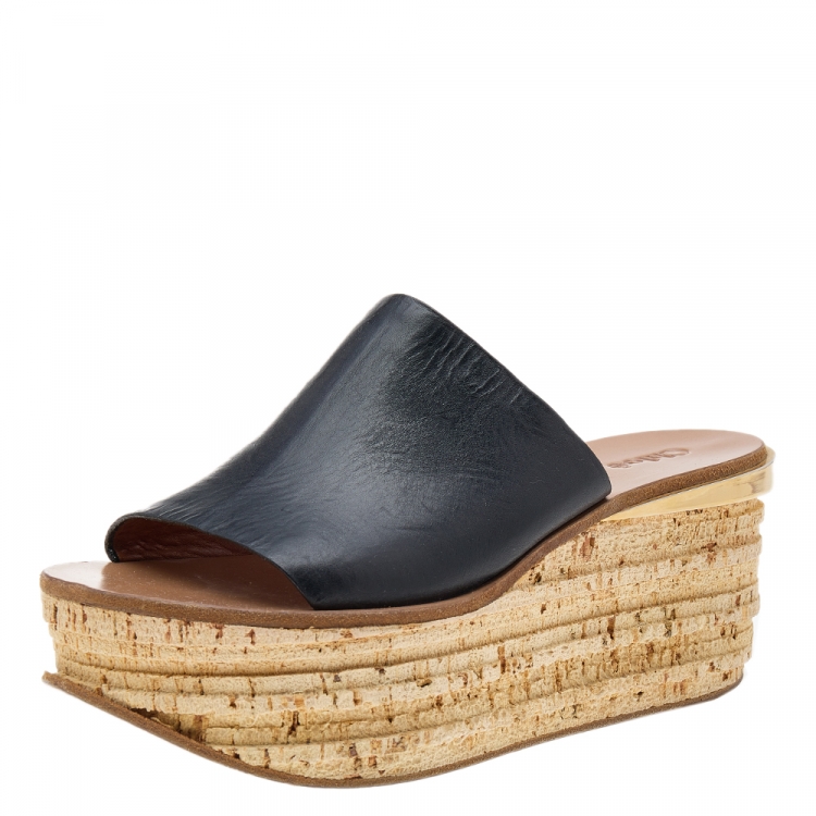 Pre Owned Chloe Black Leather Platform Wedge Slide Sandals Size 39