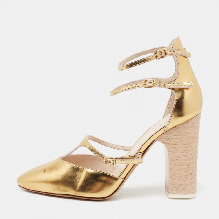 Chloe Gold Metallic Leather Block Heel Ankle-Strap Pumps Size 37