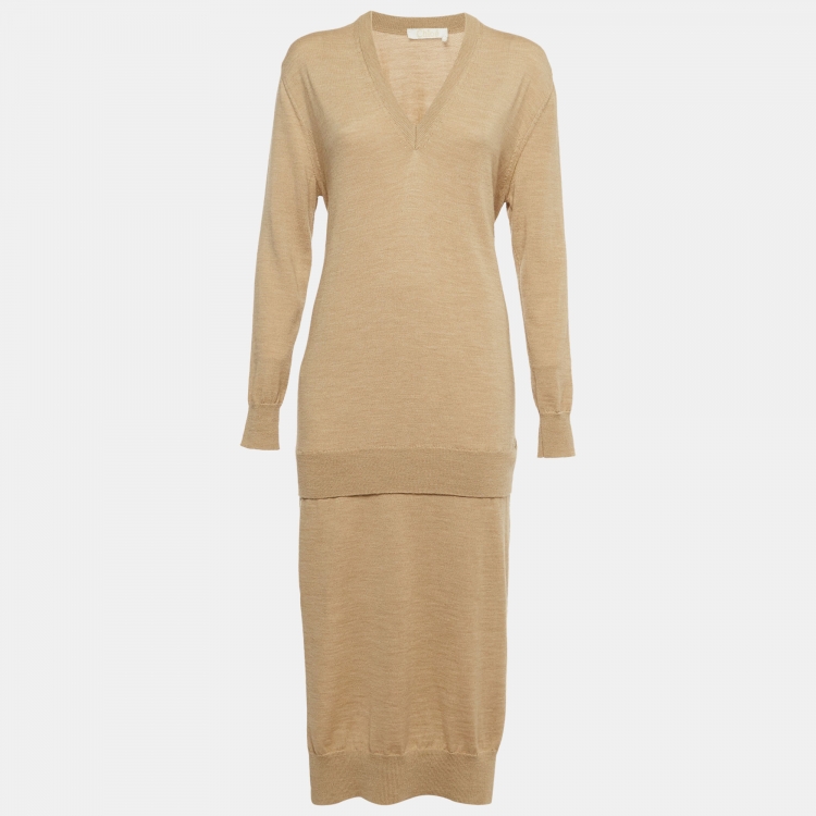 Chloe Seed Brown Wool V-Neck Sweater Midi Dress S