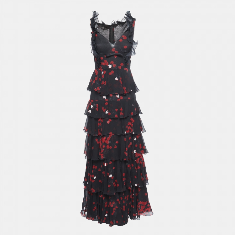 Giambattista Valli Black Strawberry Printed Silk Ruffle Detail Tiered Maxi Dress M