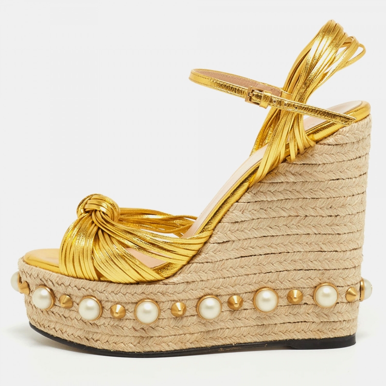 Gucci Gold Leather Strappy Knotted Pearl Embellished Wedge Espadrille Ankle Strap Sandals Size 36.5