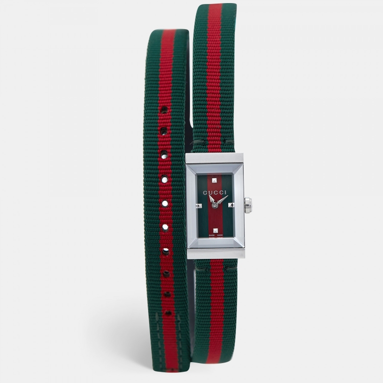 Gucci Green Red Stainless Steel Canvas Leather G-Frame YA147503 Women's Wristwatch 14 mm
