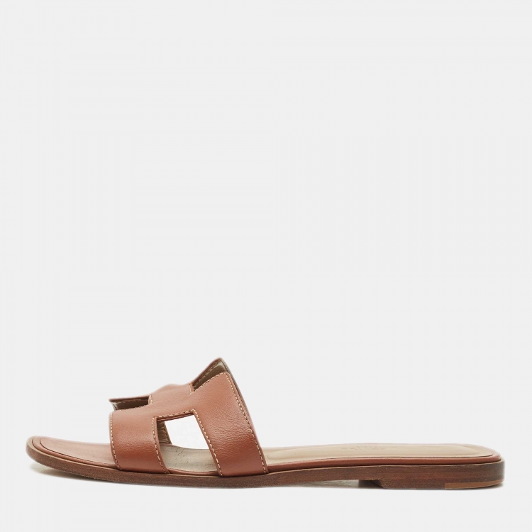 Hermes Brown Leather Oran Flat Slide Sandals Size 38