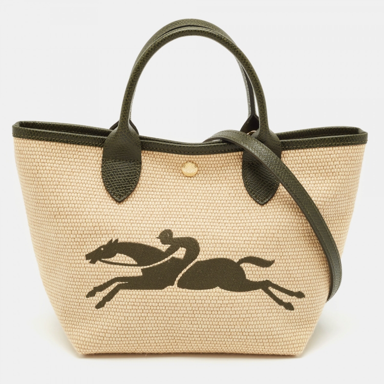 Longchamp Beige/Green Straw and Leather Small Le Panier Pliage Basket Bag