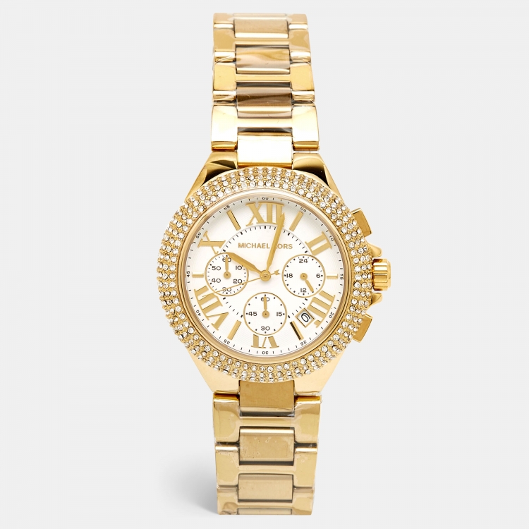 Pre Owned Michael Kors White Yellow Gold PVD Coated Stainless Steel Oversized Camille Pave MK6994 Women's Wristwatch 43 mm
