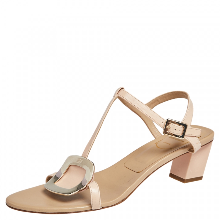 Roger Vivier Beige Leather Chips Embellished T-Strap Sandals Size 39.5