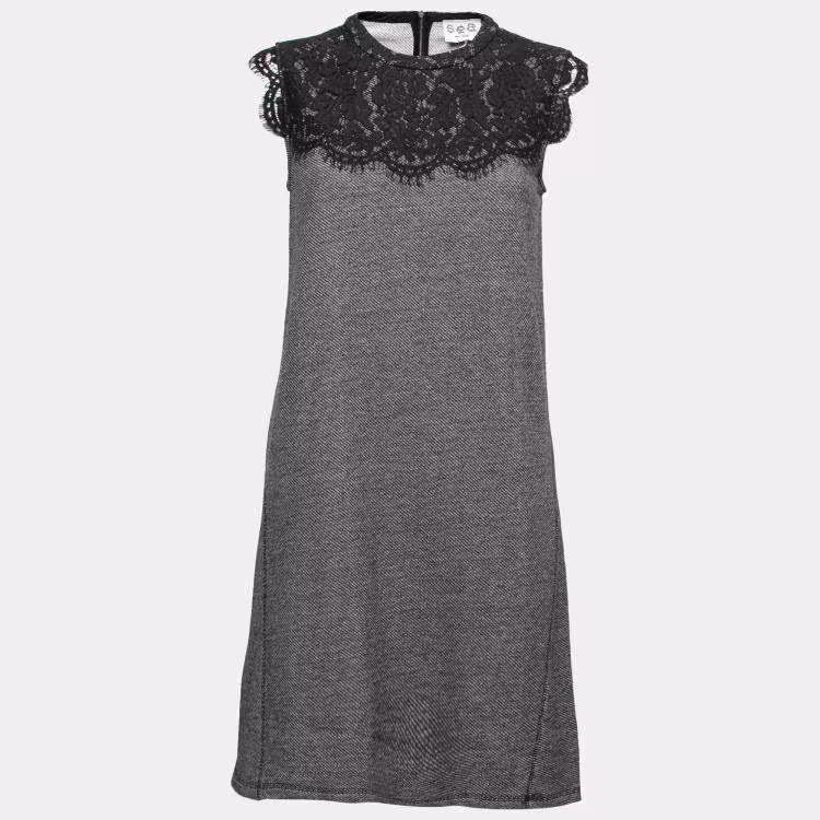 Sea Grey Wool and Lace Neckline Detail Sleeveless Dress S