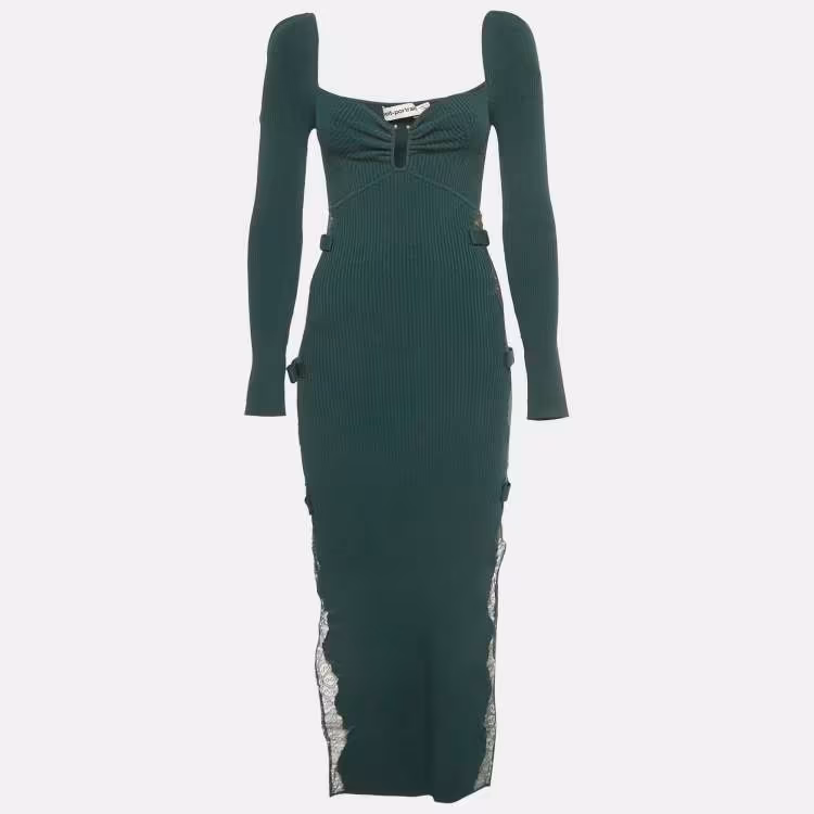 Pre Owned Self-Portrait Deep Green Lace Inserts Rib Knit Midi Dress S