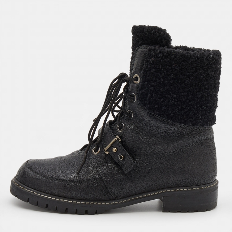 Pre Owned Stuart Weitzman Black Leather and Fur Ankle Length Boots Size 38