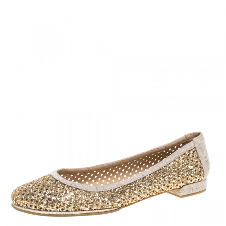 Stuart Weitzman Metallic Gold Glitter Perforated Leather and Canvas Ballet Flats Size 40