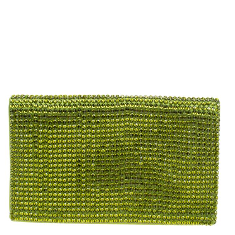 Tom Ford Green Satin Crystal Embellished Flat Clutch