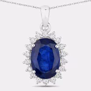 6.21 cts Blue Sapphire and Diamond 14K White Gold Halo Pendant