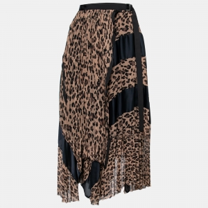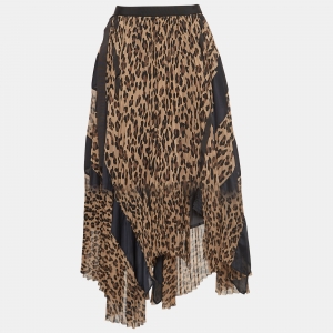 Sacai Brown Leopard Print Pleated Crepe Asymmetrical Midi Skirt S
