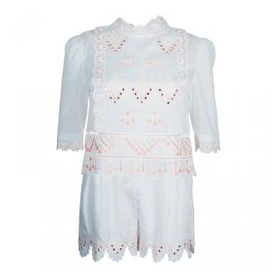 Temperley London White Mirrorwork and Cutwork Embroidered Scallop Detail Hika Top and Shorts Set M