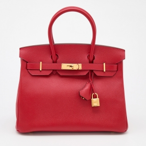 Hermes Rouge Pivoine Clemence Leather Gold Plated Birkin 35 Bag