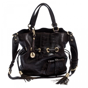 Lancel Dark Brown Croc Embossed Leather Drawstring Bucket Bag