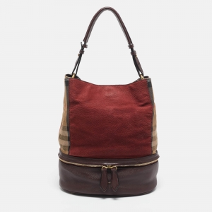 Burberry Burgundy/Beige House Check Canvas and Leather Beckett Bucket Bag