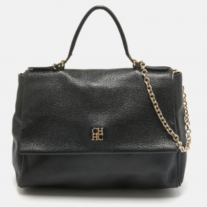 Carolina Herrera Black Embossed Leather Pushlock Flap Top Handle Bag