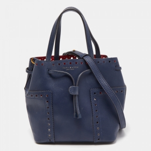 Tory Burch Navy Blue Leather Mini Block-T Bucket Bag